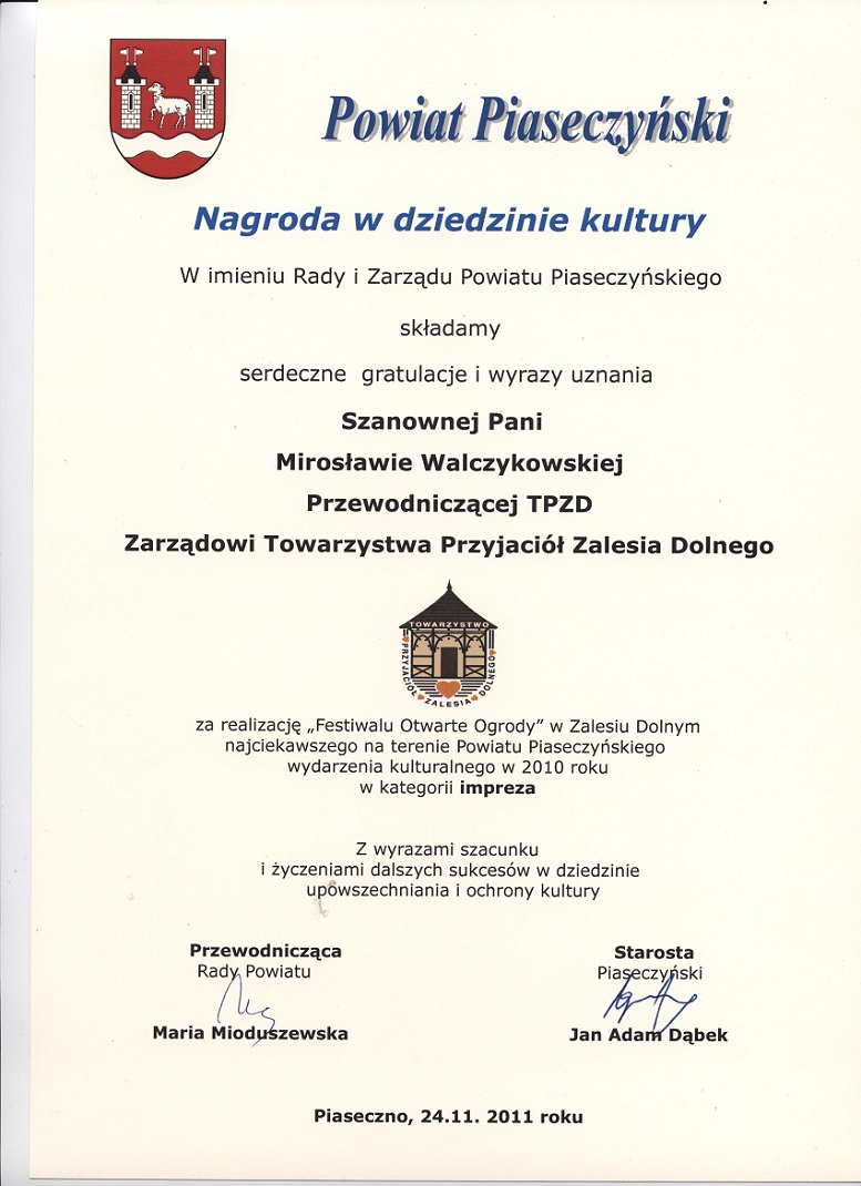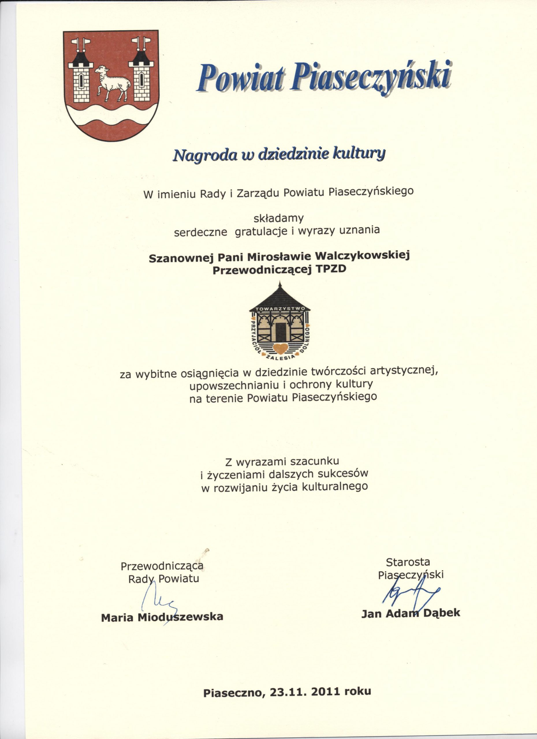 Starostwo Powiatowe w Piasecznie przyznało Przewodniczącej Towarzystwa Przyjaciół Zalesia Dolnego – Mirosławie Walczykowskiej nagrodę za wybitne osiągnięcia w dziedzinie twórczości artystycznej, upowszechnianiu i ochronie kultury na terenie Powiatu Piaseczyńskiego.